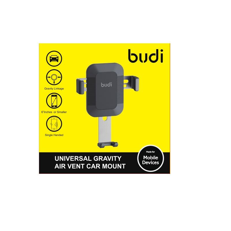 Gravitační držák do auta Budi je určen k montáži do mřížky ventilace. Ramena kolébky se automaticky zavírají pod váhou zařízení, což výrazně zvyšuje pohodlí a umožňuje umístit smartphone do kolébky jednou rukou. Vnitřní část pouzdra je vyrobena z měkkého plastu, takže nehrozí poškrábání smartphonu. Speciálně tvarovaná spodní čelist umožňuje připojit zařízení k nabíječce, aniž by bylo nutné jej vyjmout z držáku. Tento přístroj se vyznačuje solidním zpracováním a vysokou kvalitou použitých materiálů, které přispívají k jeho dlouhé životnosti a odolnosti. Držák je kompatibilní s telefony o šířce 57 až 83 mm. Hlava otočná o 360 stupňů umožňuje používat smartphone v nejvhodnějším úhlu, a to jak horizontálně, tak vertikálně. Montáž držáku na větrací mřížku zvyšuje bezpečnost, protože nezmenšuje zorné pole, což se může stát, když je zařízení namontováno na čelním skle.