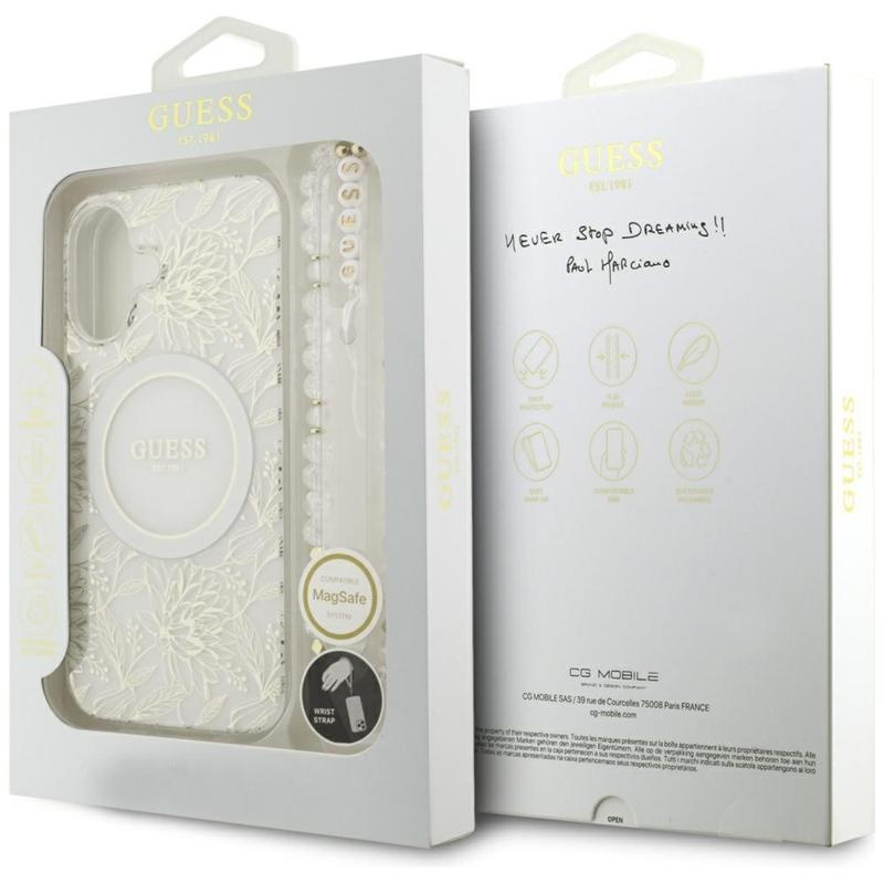 Guess IML Flowers Electro Pearl Strap MagSafe - Pouzdro iPhone 17 (bílý)