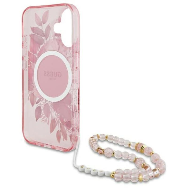Guess IML Flowers With Pearl Strap MagSafe - pouzdro pro iPhone 16 Plus (růžové)