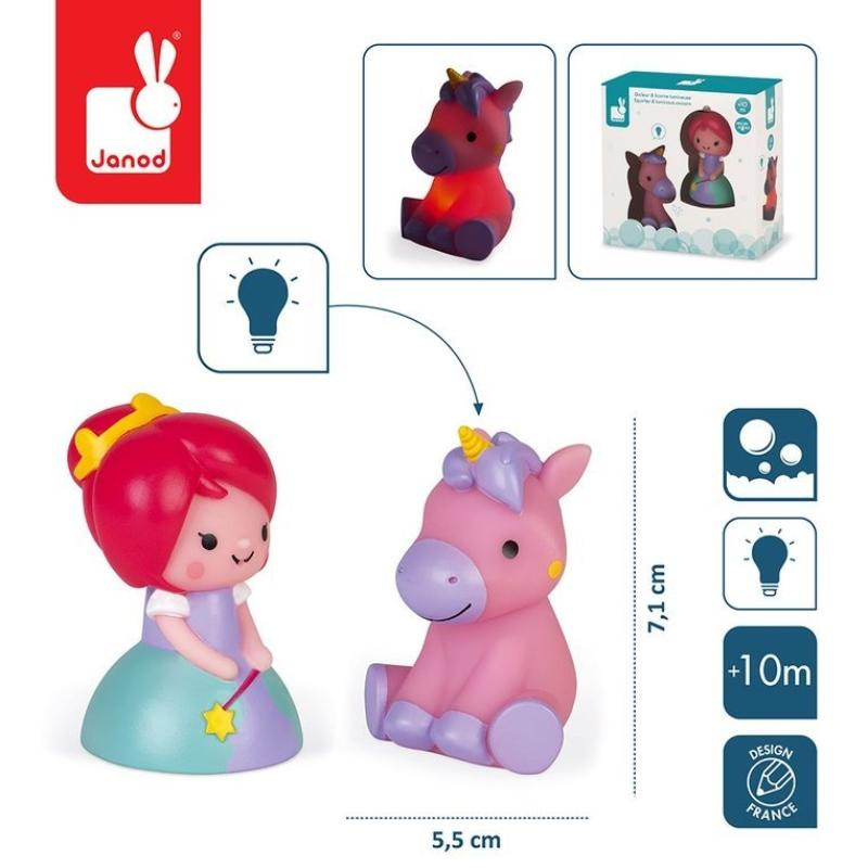 - Tato sada rozkošných figurek do koupele francouzské značky JANOD obsahuje dvě robustní hračky z voděodolného plastu. Sada obsahuje: princeznu a jednorožce - měkké, praktické, příjemné na dotek. Když je zmáčknete a naplníte vodou, vytrysknou a jedna