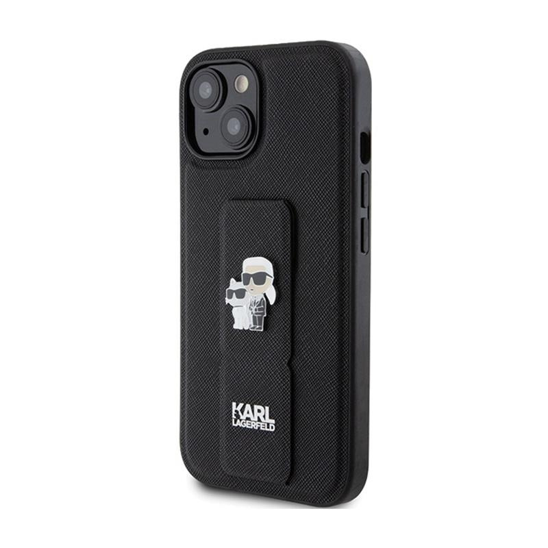 Karl Lagerfeld Gripstand Saffiano Karl & Choupette Pins - pouzdro pro iPhone 15 Plus (černé)