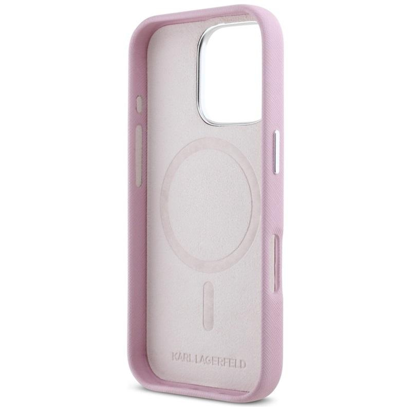 Karl Lagerfeld Saffiano Full Wrapped Elongated Metal Logo MagSafe - Pouzdro pro iPhone 16 Pro (růžové)