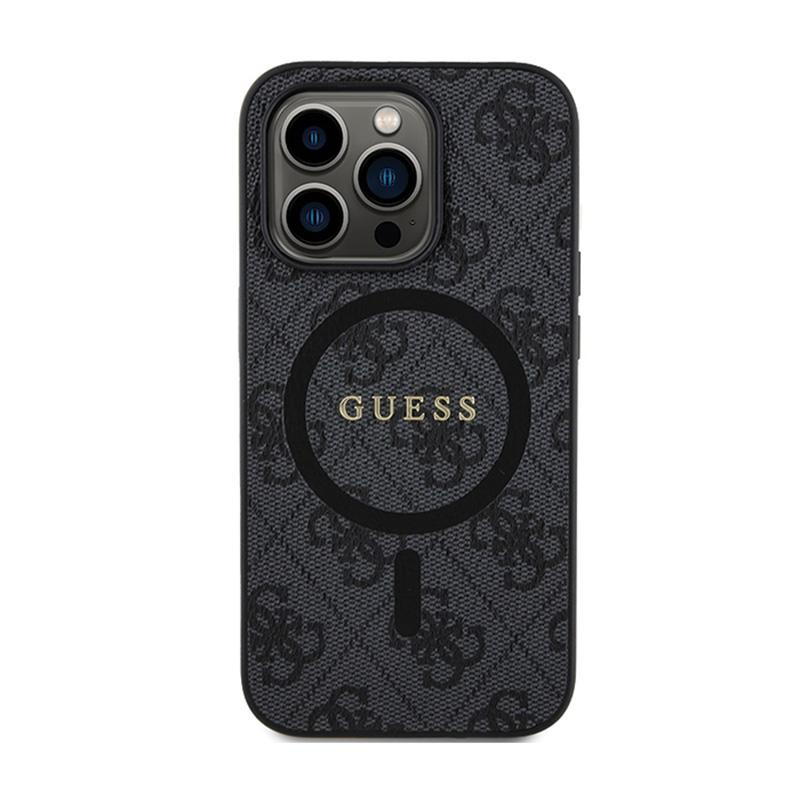 - Guess 4G Collection Leather Metal Logo MagSafe má jeden z nejznámějších motivů používaných společností Guess. Celý zadní panel pouzdra je pokryt emblémy 4G, které jsou umístěny na na dotek velmi příjemné textuře saffiano. Velké zlaté logo m