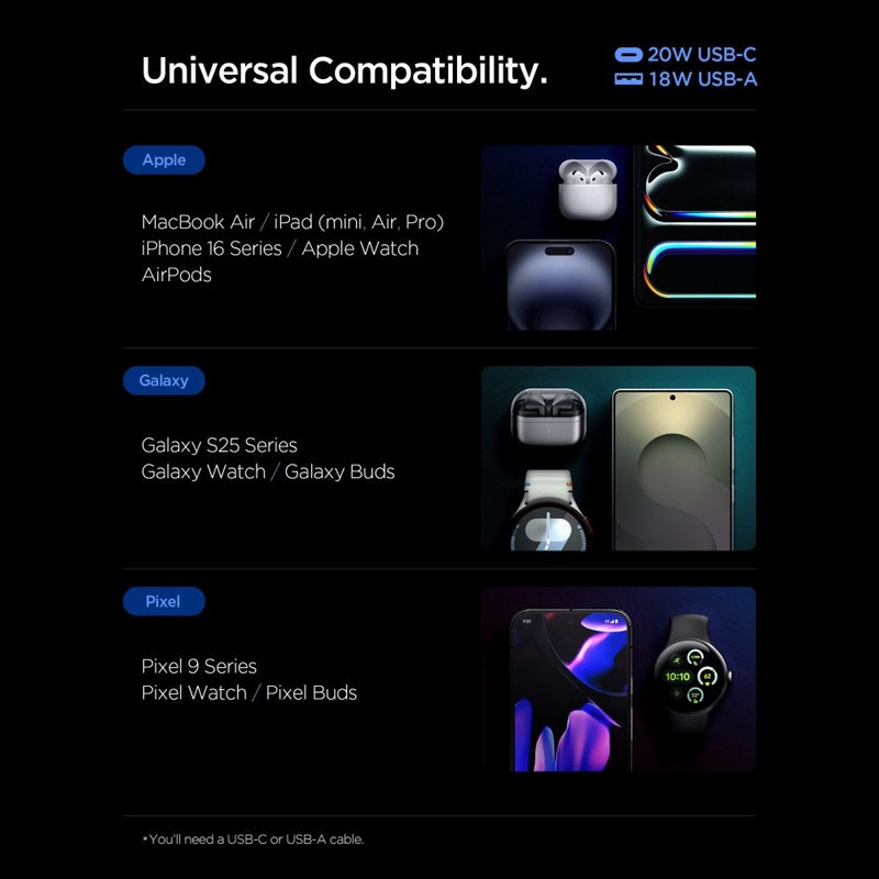Spigen Essential EE202EU GaN Pro je kompaktní a mimořádně efektivní nástěnná nabíječka navržená pro rychlé, inteligentní a bezpečné napájení vašich zařízení. Je vybavena 20W portem USB-C a 18W portem USB-A, takže můžete nabíjet dvě zařízení současně a dodává tak optimální energii chytrým telefonům, tabletům, sluchátkům a dalšímu příslušenství.