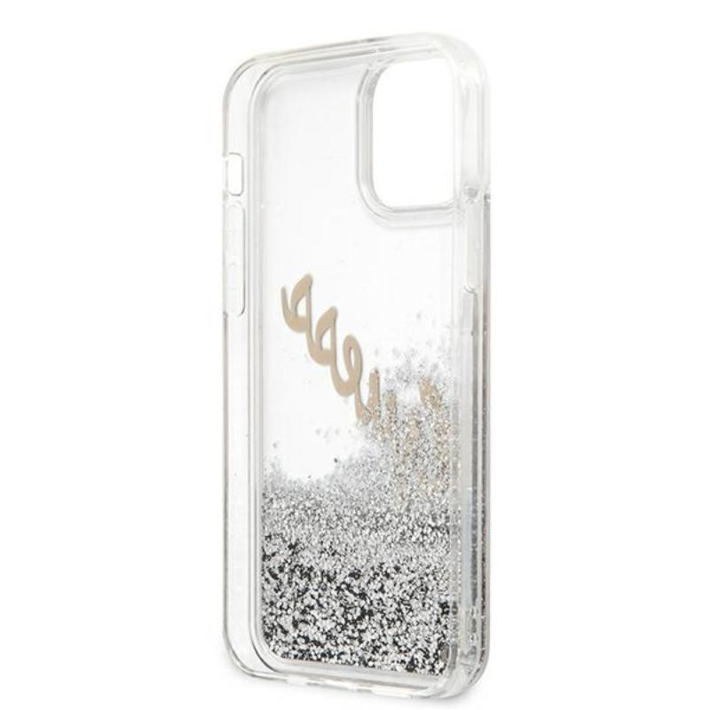 Pouzdro Guess Glitter Vintage Script - iPhone 12 Pro Max (stříbrné)
