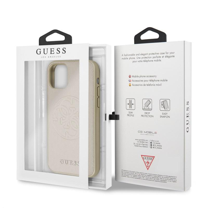 • Guess Saffiano 4G Circle z vysoce kvalitní ekokůže. Pouzdro je zdobeno vyraženým velkým kruhovým logem Guess 4G. Kromě toho je ve spodní části umístěno další logo ve zlaté barvě. Pouzdro chrání zadní stranu, boky a tlačítka zařízení, upevňuje se na zadní