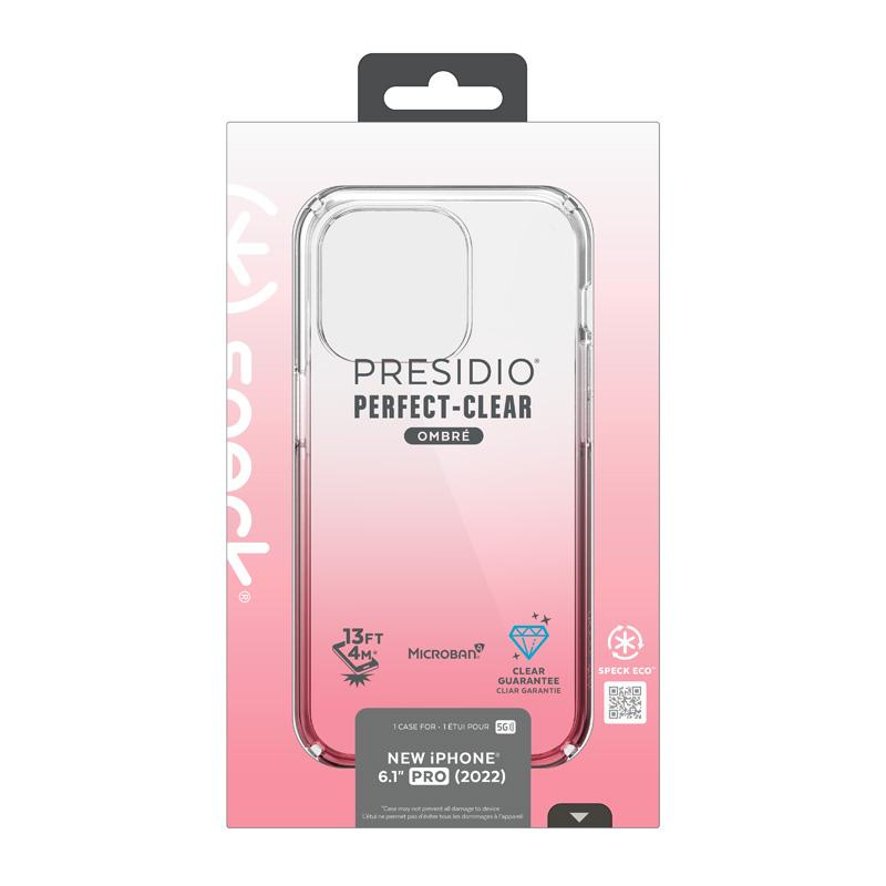 Presidio® Perfect Clear + Ombre je průhledný design s ombré efektem, který odhaluje plnou estetickou přitažlivost telefonu a zároveň využívá nejnovější technologii IMPACTIUM™ Shock Barrier k ochraně telefonu před poškozením při pádu. Toho je dosaženo díky dvěma vrstvám: vnější vrstvě, která rozptyluje sílu nárazu, a vnitřní vrstvě IMPACTIUM™, která absorbuje nárazy. Tím je telefon účinně chráněn před poškozením. Testy prokázaly, že pouzdro vydrží pády z výšky téměř 4 metrů. Společnost Speck si navíc patentovala systém ochrany displeje ve svých pouzdrech, který minimalizuje riziko poškození při pádu telefonu displejem dolů. Všechny produkty Speck jsou testovány na odolnost proti poškrábání, chemickou odolnost a přesné uchycení, aby se dosáhlo vysoké kvality pouzdra.
