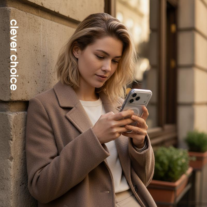 Průhledný ochranný kryt pro iPhone 17 Pro s vestavěným magnetem pro nabíječku MagSafe a příslušenství. Magnetický kroužek (složený z 39 menších magnetů) skrytý v hybridním pouzdře zajišťuje, že nabíječka a další příslušenství MagSafe vždy perfektně padnou k telefonu.