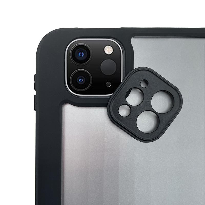 Zadní strana iPadu je chráněna průhledným polykarbonátem, který zabraňuje poškrábání a poškození pouzdra a zároveň zajišťuje bezpečné uchopení. Rámeček kolem zařízení je naopak vyroben z termoplastického materiálu, který dále chrání hrany a také fotoaparát.