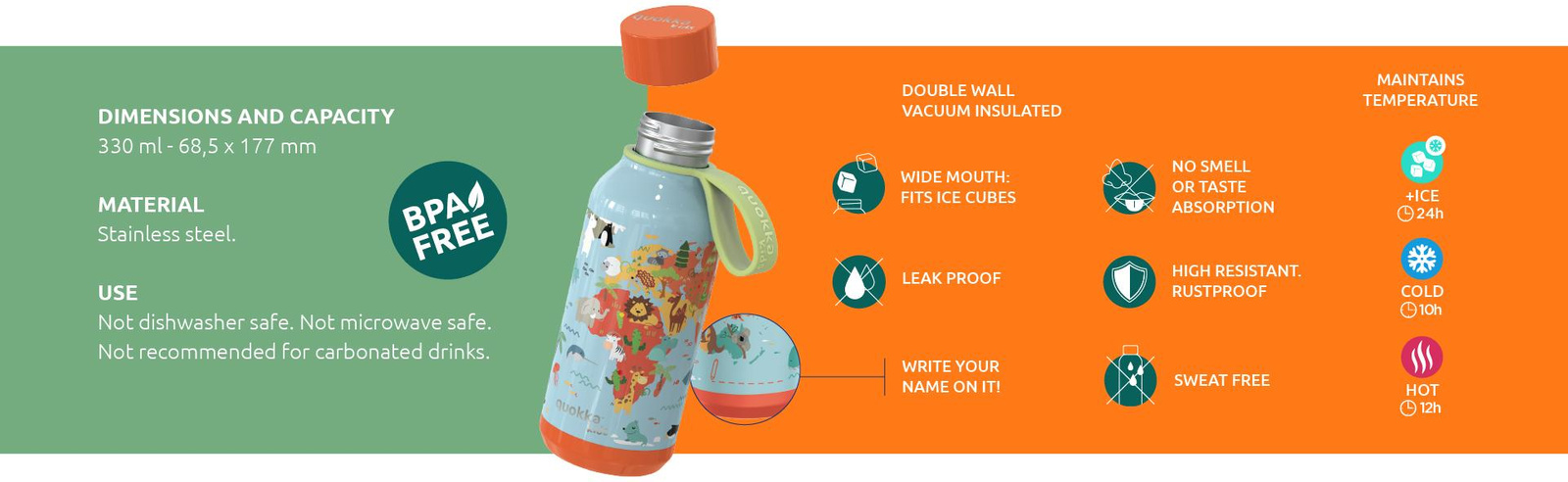 Quokka Solid Kids s popruhem - termoláhev z nerezové oceli o objemu 330 ml s popruhem (Jungle)
