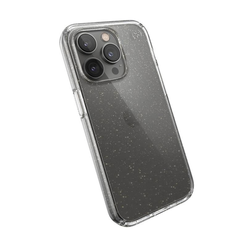Speck Presidio Perfect-Clear s třpytkami - pouzdro pro iPhone 14 Pro s povrchovou úpravou MICROBAN (čiré / zlaté třpytky)