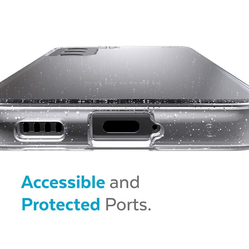 Presidio® Perfect Clear with Glitter je průhledný design, který odhaluje všechny estetické vlastnosti telefonu a zároveň obsahuje nejnovější technologii IMPACTIUM™ Shock Barrier, která chrání telefon před poškozením při pádu. To vše díky dvěma vrstvám: vnější vrstvě, která rozptyluje sílu nárazu, a vnitřní vrstvě IMPACTIUM™, která tlumí nárazy. Pouzdro tak účinně zajišťuje telefon a chrání jej před poškozením. Podle testů vydrží pouzdro pád z výšky téměř 4 m. Společnost Speck navíc ve svých pouzdrech patentovala systém ochrany displeje, který minimalizuje riziko poškození telefonu při pádu displejem dolů. Všechny výrobky Speck jsou testovány na odolnost proti poškrábání, chemickou odolnost a přesné uchycení, aby se zajistila vysoká kvalita pouzder.