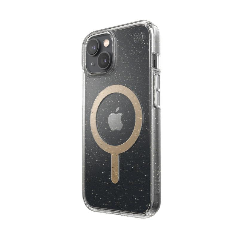 Speck Presidio Perfect-Clear with Glitter + MagSafe - pouzdro pro iPhone 14 / iPhone 13 s povrchovou úpravou MICROBAN (čiré / zlaté třpytky)