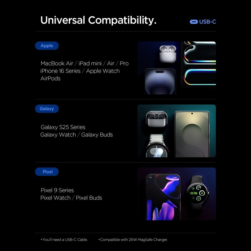 Kompaktní design dělá ze Spigen EE472EU spolehlivé řešení pro náročné uživatele, kteří chtějí rychle, bezpečně a pohodlně nabíjet dvě zařízení současně.