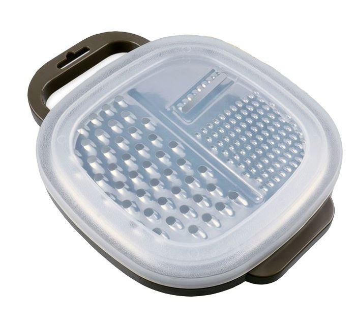 Mehrzweckreibe mit drei Messertypen und Abfallbehälter in grau. Zusätzlicher Deckel schützt die Reibe bei der Aufbewahrung. Gewicht: 0,4 kg.
