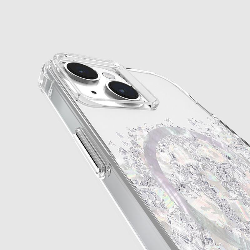 - Schlanke und elegante Schutzhülle für das iPhone 15, verziert mit echtem Perlmutt. Eingebaute Magnete sorgen dafür, dass das MagSafe-Ladegerät jedes Mal genau passt. Die Oberfläche des Gehäuses wurde außerdem gegen Bakterien behandelt, so dass die