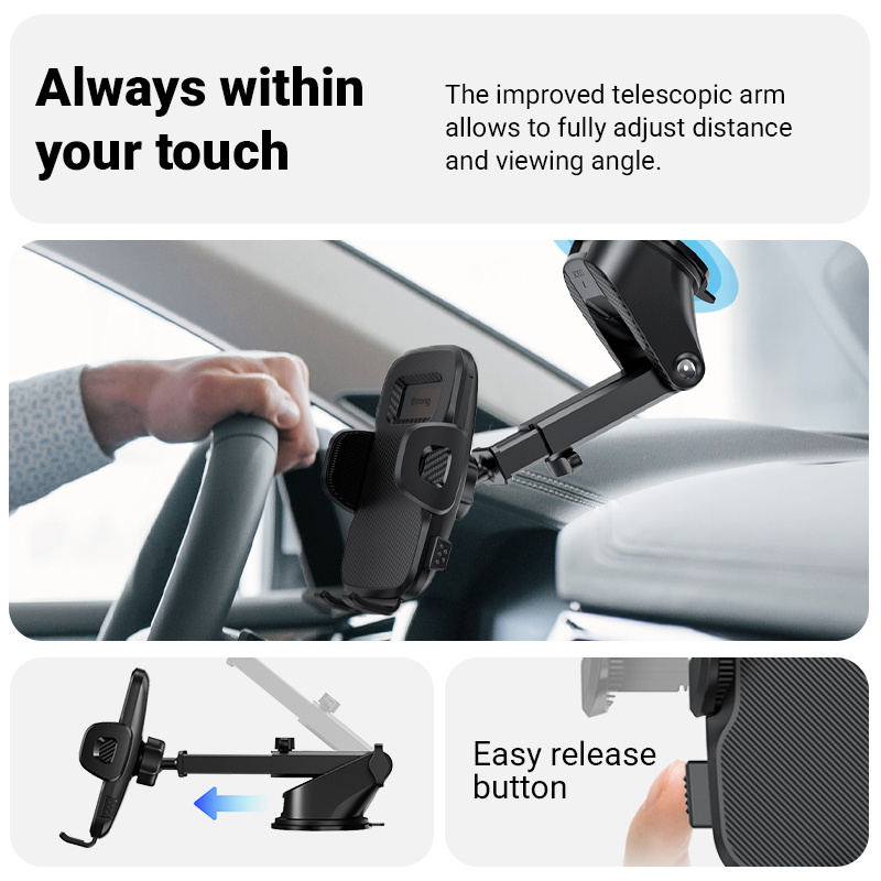 Crong Carclip Dashboard™ ist eine moderne, universelle 2-in-1-Autohalterung, die Komfort, Funktionalität und Sicherheit auf jeder Fahrt vereint. Sie bietet eine stabile und sichere Smartphone-Befestigung, sodass Sie sich voll und ganz auf das Fahren konzentrieren können. Der starke Saugnapf haftet sicher an der Windschutzscheibe und glatten Armaturenbrettoberflächen. Die Halterung ist wiederverwendbar – nach dem Abnehmen einfach mit Wasser abspülen, um die volle Haftkraft wiederherzustellen. Die verstellbaren Arme (55 bis 101 mm) passen für die meisten Smartphones. Spezielle Gummipads an den Armen sorgen für einen festen Halt ohne Kratzer. Der Teleskoparm (81 bis 141 mm) ermöglicht es Ihnen, Ihr Gerät im optimalen, ergonomischen Winkel zu positionieren und so bequem auf den Bildschirm und alle Funktionen zuzugreifen. Der beidseitige Entriegelungsmechanismus, der über Tasten an den Seiten der Halterung bedient wird, ermöglicht ein schnelles und einhändiges Abnehmen des Smartphones. Eine spezielle Konstruktion mit stoßdämpfenden Elementen schützt Ihr Gerät vor Stößen, Vibrationen und versehentlichem Herunterfallen, selbst auf unebenen Straßen. Der um 360° drehbare Kopf ermöglicht es Ihnen, die Halterung in jedem Winkel einzustellen und zu arretieren. So haben Sie Ihr Smartphone jederzeit griffbereit für Navigation, Anrufe oder Medienwiedergabe. Dank des Designs der Halterung sind die Ladekabel frei zugänglich, sodass Sie Ihr Gerät laden können, ohne es aus der Halterung zu nehmen. Warum die Krong Carclip Dashboard™? Stabilität und Sicherheit: Der starke Saugnapf hält die Halterung unter allen Fahrbedingungen sicher an ihrem Platz. Wiederverwendbarer Saugnapf: Der transparente Saugnapf aus Gummi haftet problemlos auf glatten Oberflächen. Nach dem Entfernen mit Wasser abspülen, um die volle Haftung wiederherzustellen.