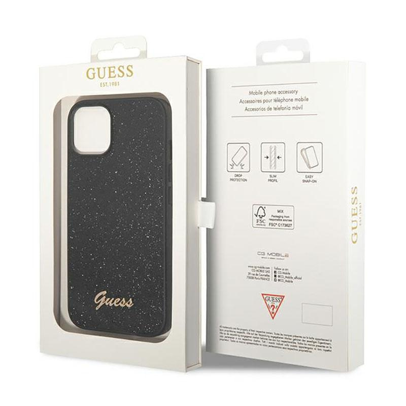 Guess Glitter Flakes Metal Logo Case - Hülle für iPhone 14 Plus (Schwarz)