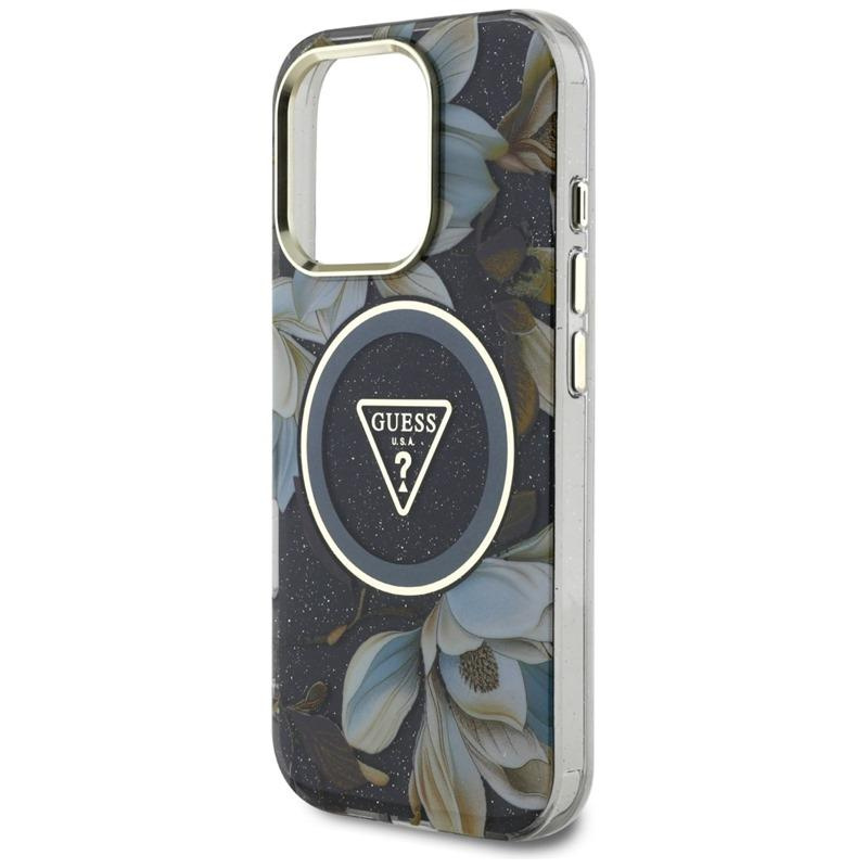 Guess Glitter Flowers Triangle Buttons MagSafe - Hülle für iPhone 16 Pro Max (schwarz)