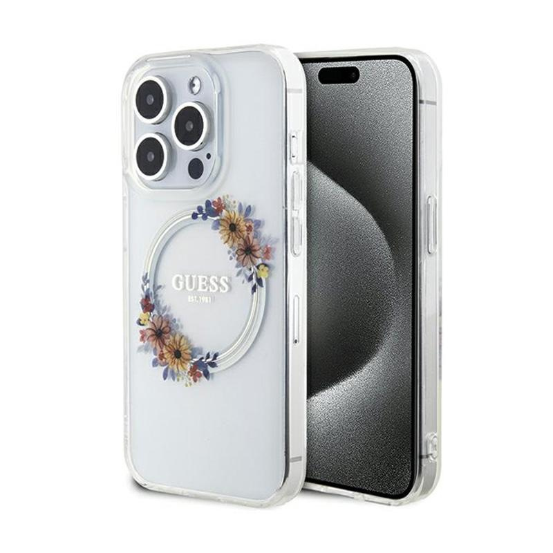 Guess IML Flowers Wreath MagSafe - Hülle für iPhone 15 Pro (Transparent)