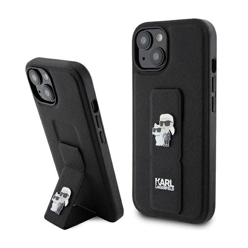 Karl Lagerfeld Gripstand Saffiano Karl & Choupette Pins - iPhone 15 Plus Tasche (Schwarz)