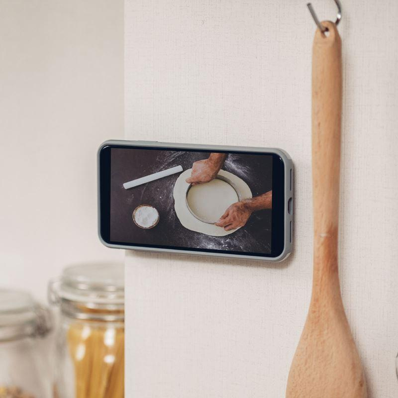 - Moshi SnapTo™ ist eine magnetische Halterung, die mit superstarken 3M-Klebestreifen an der Wand befestigt wird und eine Tragfähigkeit von 1,0 kg hat. Das Telefon kann frei gedreht und vertikal oder horizontal positioniert werden, z. B. beim Kochen, Putzen