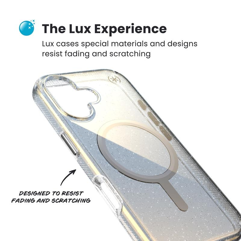 Das Speck Presidio® Lux MagSafe® ist eine Hülle mit integriertem Magneten, die mit Apple MagSafe®-Zubehör kompatibel ist. Das transparente Design mit dezentem, spiegelähnlichem Glanz und Glitzerpartikeln verleiht dem Gerät einen eleganten, modernen Look. Die Hülle ist mit der IMPACTIUM™ Shock Barrier-Technologie ausgestattet, die das Smartphone bei Stürzen aus bis zu 4 Metern Höhe vor Beschädigungen schützt. Dies wird durch zwei Schichten erreicht: eine äußere Schicht, die die Aufprallkraft verteilt, und eine innere IMPACTIUM™-Schicht, die Stöße absorbiert. Der erhöhte Rand um Display und Kamera bietet zusätzlichen Schutz vor Kratzern und Beschädigungen. Die Hülle besteht zu 50 % aus recyceltem Kunststoff, der sich unter UV-Licht nicht verfärbt. Eine spezielle Beschichtung verhindert das Vergilben der Speck-Hülle und sorgt dafür, dass sie lange wie neu aussieht. Mehr Informationen unter www.speckeco.com