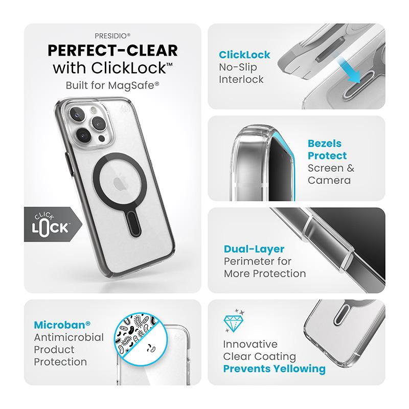 Das Speck Presidio® Perfect-Clear MagSafe® mit ClickLock™-Antirutsch-Technologie ist eine transparente Hülle mit integriertem Magneten, die mit Apple MagSafe®-Zubehör kompatibel ist.