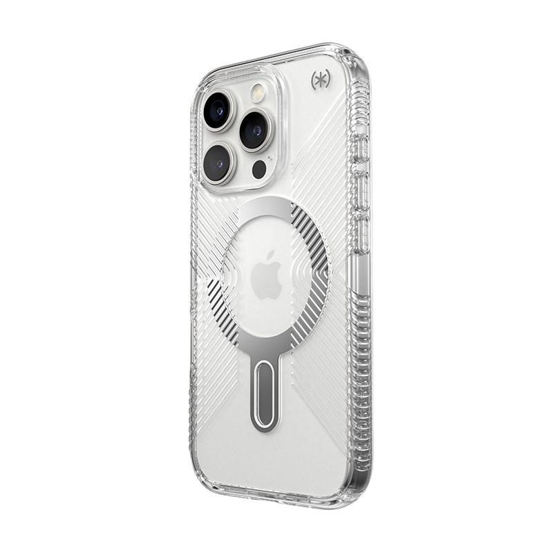 Speck Presidio Perfect-Clear Grip ClickLock & MagSafe - iPhone 16 Pro Hülle (Transparent / Chrom-Finish / Serene Silver)
