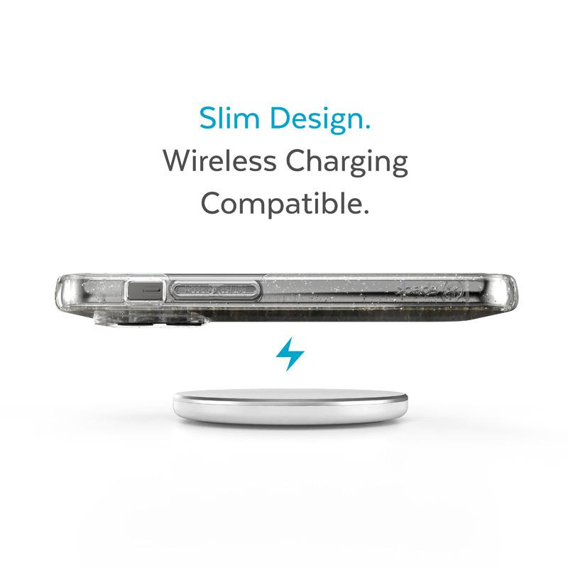 Presidio® Perfect Clear with Glitter ist ein transparentes Design mit eingebetteten, glitzernden Kristallen, das die ästhetischen Qualitäten des Telefons voll zur Geltung bringt.Gleichzeitig kommt die neueste IMPACTIUM™ Shock Barrier Technologie zum Einsatz, die das Telefon bei einem Sturz vor Schäden schützt. Dies ist zwei Schichten zu verdanken: der äußeren Schicht, die die Kraft des Aufpralls verteilt, und der inneren IMPACTIUM™-Schicht, die den Aufprall absorbiert. Das Etui sichert das Telefon effektiv und schützt es vor Beschädigungen. Tests haben ergeben, dass das Gehäuse einen Sturz aus fast 4 m Höhe überstehen kann. Darüber hinaus hat Speck ein Displayschutzsystem für seine Hüllen patentiert, das das Risiko einer Beschädigung des Telefons minimiert, wenn es mit dem Bildschirm nach unten fallen gelassen wird. Alle Speck-Produkte werden auf Kratzfestigkeit, Chemikalienbeständigkeit und Passgenauigkeit getestet, um eine hohe Qualität der Gehäuse zu gewährleisten.