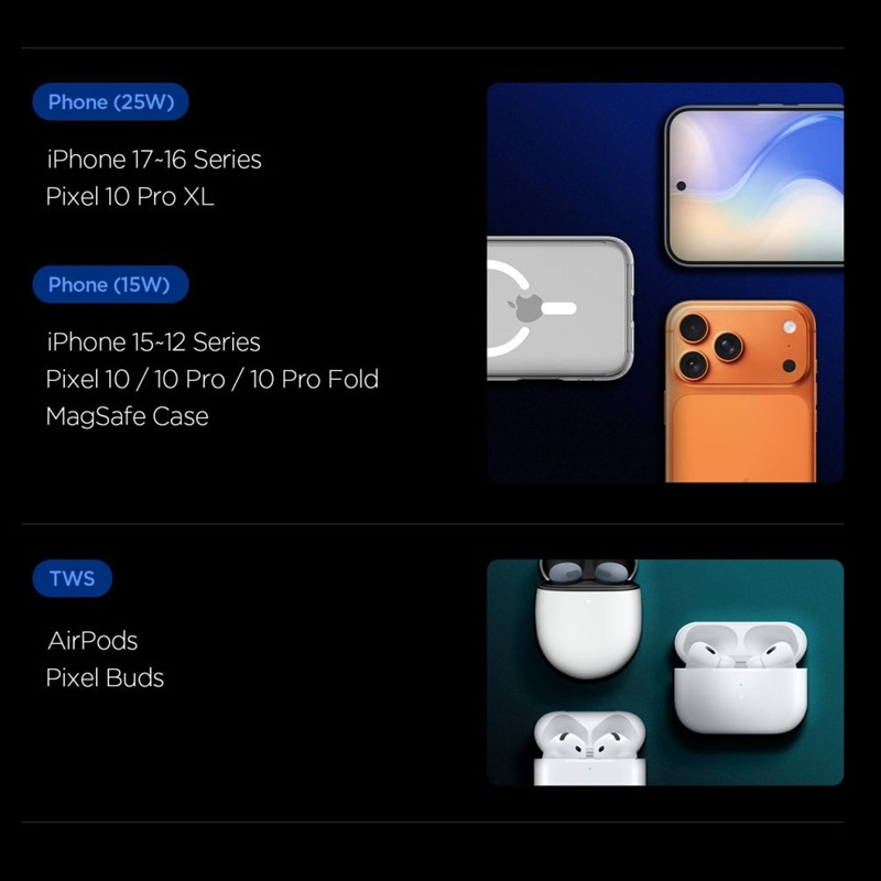 Der Spigen Essential EF302MOQ ist eine moderne 2-in-1 faltbare Ladestation, die für Menschen konzipiert wurde, die maximale Bequemlichkeit, Effizienz und Eleganz in einem einzigen kompakten Gerät suchen. Das Ladegerät ist mit dem neuesten Qi 2.2-Standard kompatibel und bietet 25W-Schnellladen für Smartphones sowie 5W für TWS-Ohrhörer wie AirPods oder Pixel Buds. So können Sie zwei Geräte gleichzeitig – schnell, drahtlos und ohne viel Platz – mit Strom versorgen.