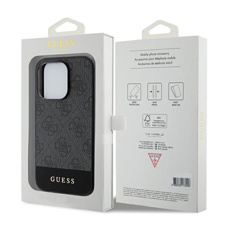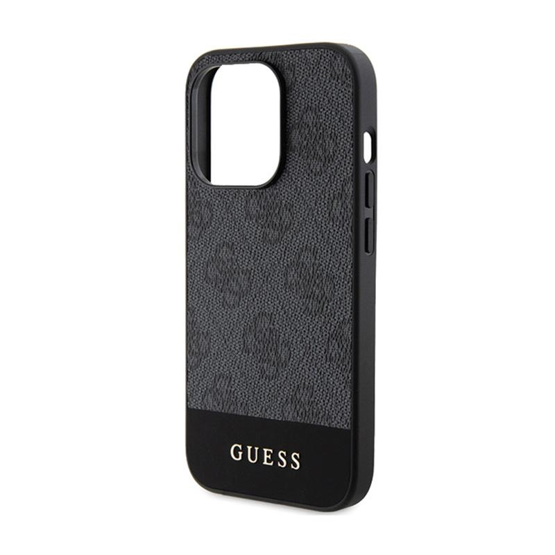 - Guess 4G Bottom Stripe Metal Logo Collection features one of the more famous motifs used by Guess. The entire back panel of the case is covered with the manufacturer's emblems, which are placed on a very pleasant to the touch saffiano texture. High cl