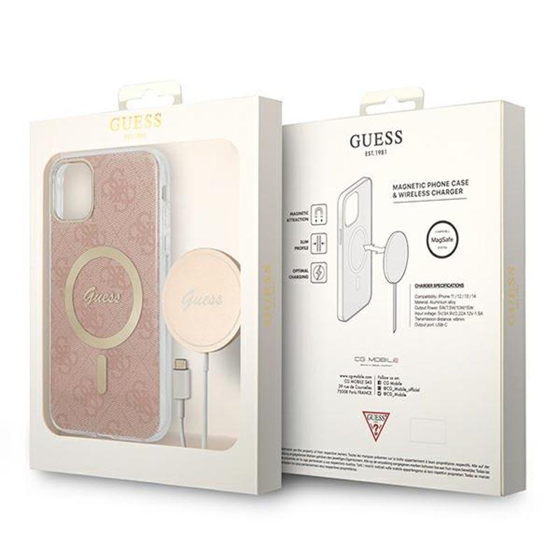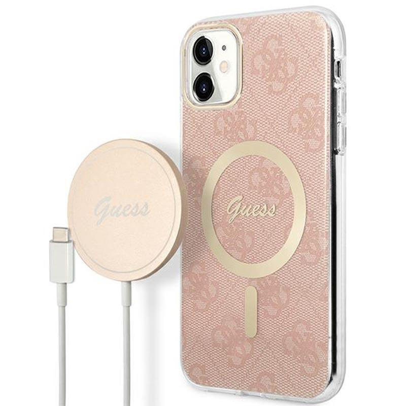 Guess Bundle Pack MagSafe 4G - MagSafe iPhone 11 case + charger set (pink/gold)
