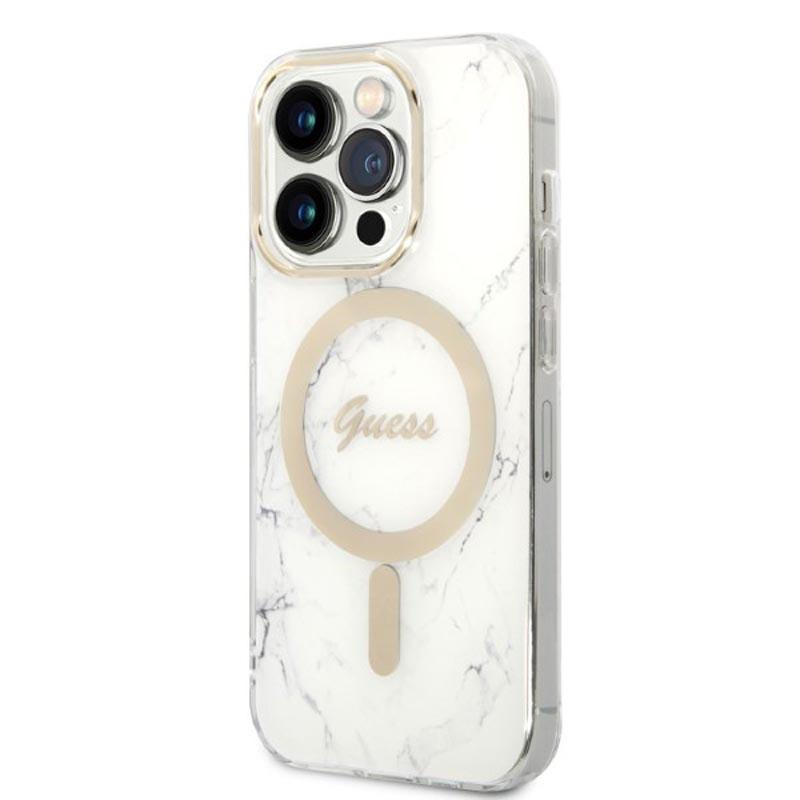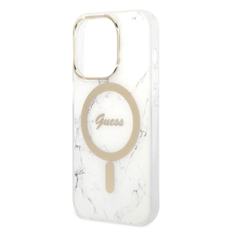 Guess Bundle Pack MagSafe IML Marble - MagSafe iPhone 14 Pro Max Case + Charger Set (white/gold)