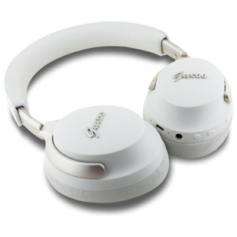 The beige color gives them a stylish, minimalist look that is perfect for any occasion. The headphones are decorated with the characteristic Guess logo, which emphasizes their luxurious character.