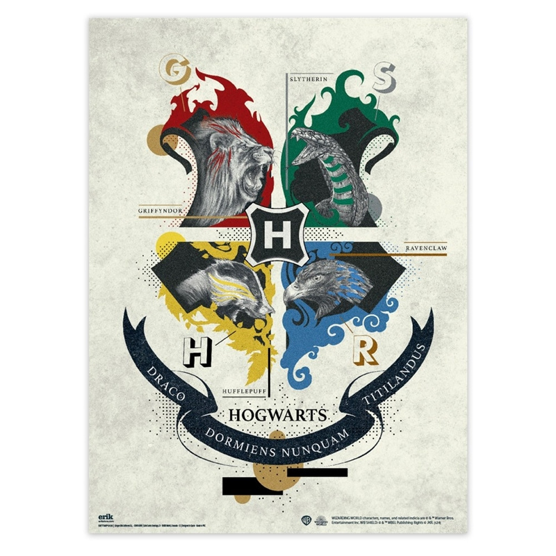 The set includes two unique designs inspired by the world of Harry Potter. The first poster features the Hogwarts crest with the symbols of the four houses – Gryffindor, Slytherin, Ravenclaw, and Hufflepuff – along with the Latin motto “Draco Dormiens Nunquam Titillandus”. The second poster depicts the