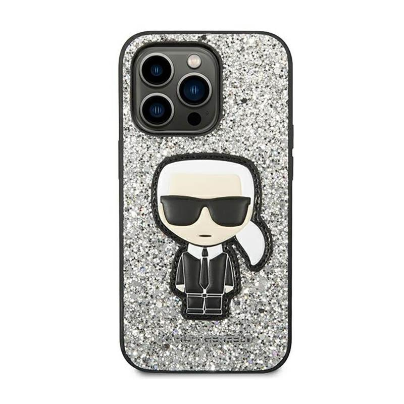 - Karl Lagerfeld Glitter Flakes Ikonik is a case, whose construction is made of high-quality materials and decorated with sewn-on graphics of the designer, additional charm is added by sunken shimmering silver glitter.