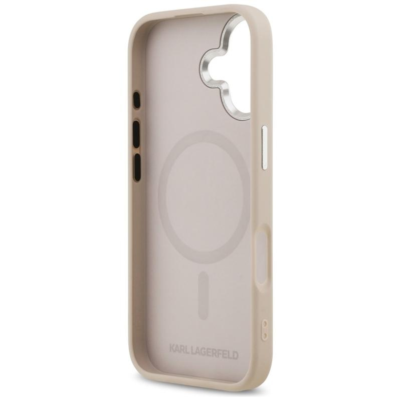 The whole thing is complemented by an aluminum camera frame and matching side buttons, which add an exclusive character to the whole thing. The MagSafe ring features a subtle "KARL LAGERFELD" logo to enhance the accessory's luxurious look.