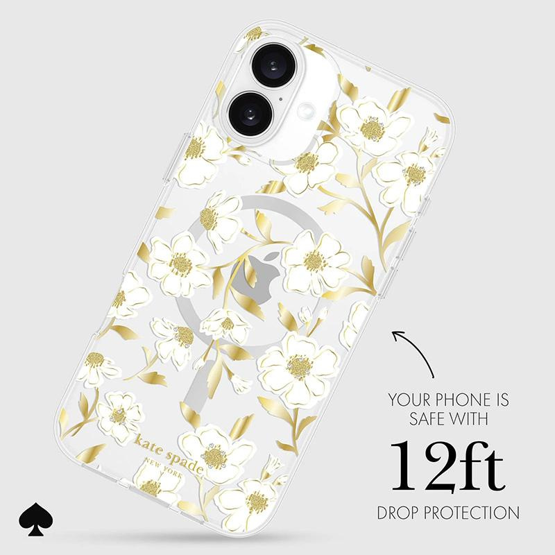 - Elegant and slim Kate Spade New York Protective Gems MagSafe case for iPhone 16 Plus with Sunshine Floral motif charms with its sophisticated design, combining style with luxury. Subtle gold accents and crystal embellishments add a touch of glamour, or