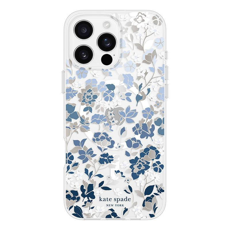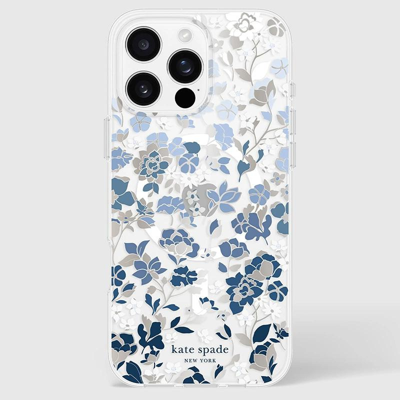 - Elegant and slim Kate Spade New York Protective Gems MagSafe case for iPhone 16 Pro Max with Flowerbed Blue motif charms with a sophisticated design, combining style with luxury. Subtle silver accents and crystal embellishments add to its sparkle,