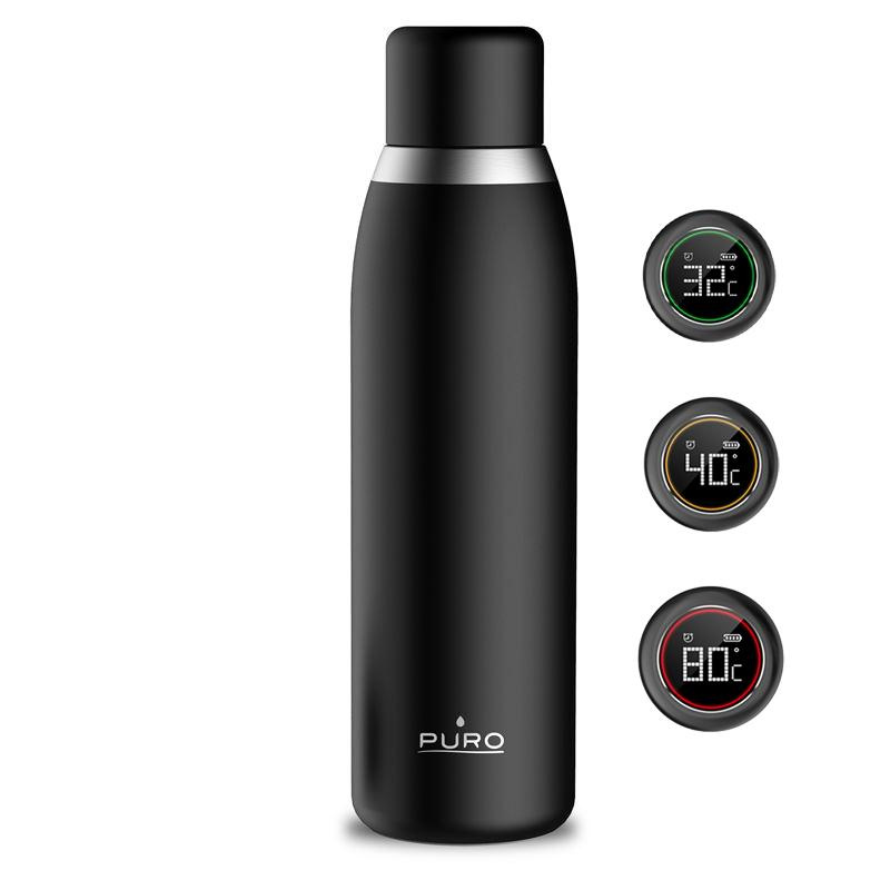 - PURO Smart thermal bottle, which shows the current temperature of the drink on an LCD display located in the cap. The integrated touchscreen additionally allows you to set audio reminders for regular drinking and indicates the current charge level