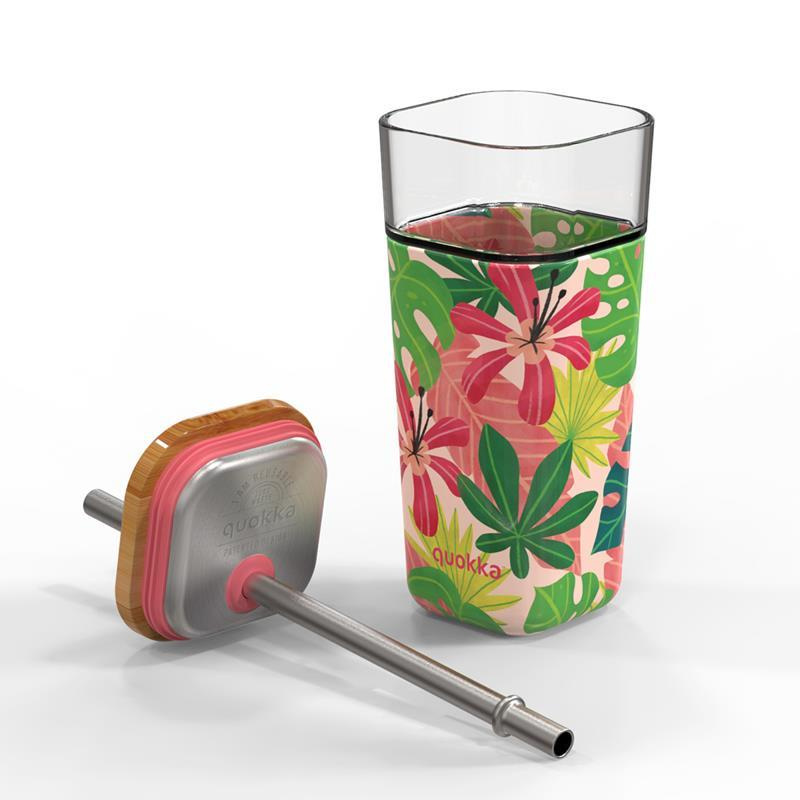 Quokka Liquid Cube - 540 ml glass mug with stainless steel straw (Pink Jungle)