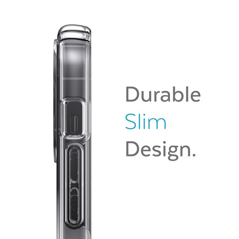 The Presidio® Perfect Clear + Ombre is a transparent design with an Ombre effect, revealing all the aesthetic qualities of the phone, while incorporating the latest IMPACTIUM™ Shock Barrier technology to protect the phone from damage when dropped. It's all thanks to two layers: an outer layer that disperses the force of impact and an inner IMPACTIUM™ layer that absorbs shock. Thus, the case effectively secures the phone and protects it from damage. According to tests, the case can withstand a fall from a height of almost 4 m. In addition, Speck has patented a display protection system in its cases that minimizes the risk of damage to the phone when dropped with the screen down. All Speck products are tested for scratch resistance, chemical resistance, and precise fit in order to deliver high quality cases.