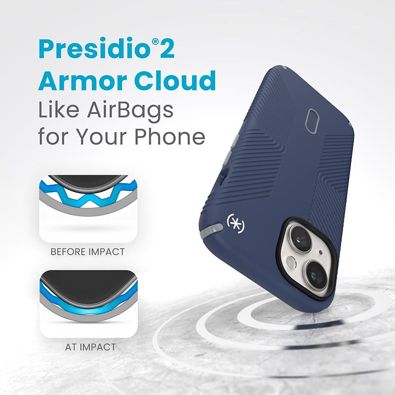 The Speck Presidio®2 Grip MagSafe® with ClickLock™ Interlock anti-slip technology is a super protective case with a built-in magnet, compatible with Apple MagSafe® accessories.