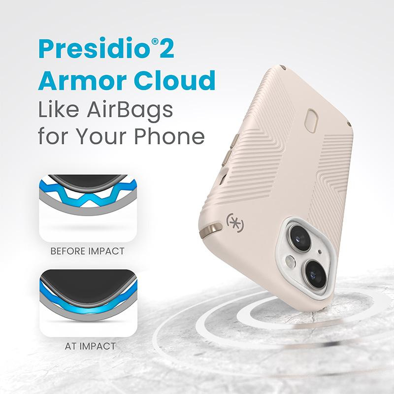 The Speck Presidio®2 Grip MagSafe® with ClickLock™ Interlock anti-slip technology is a super protective case with a built-in magnet, compatible with Apple MagSafe® accessories.