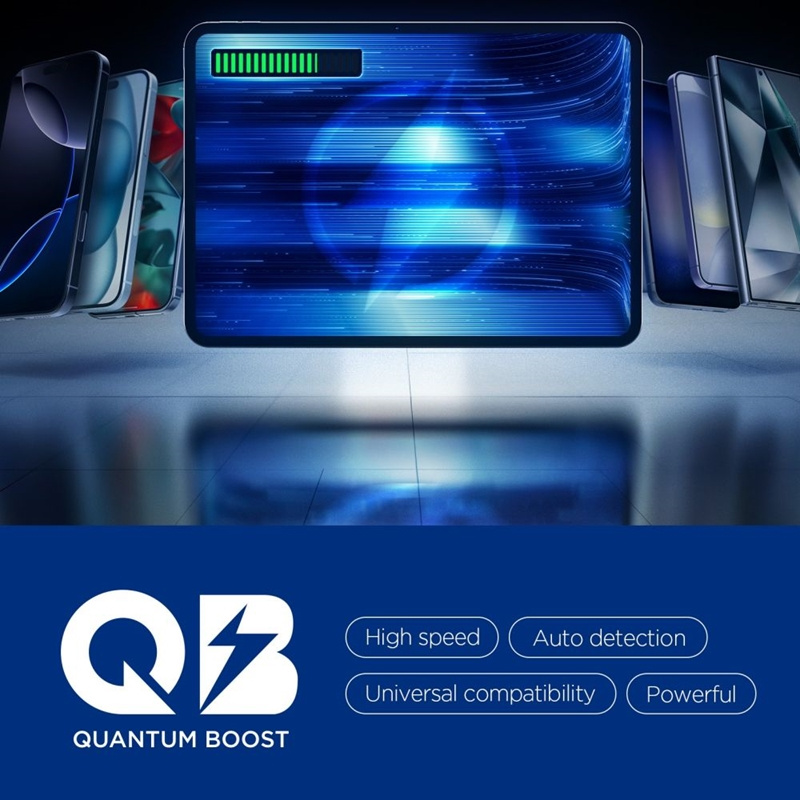 Quantum Boost technology automatically adjusts charging parameters to the device, maximizing efficiency and shortening charging times. Safety is ensured by advanced protection systems – Overcharge Prevention, Voltage Matching, and Voltage Regulation – which protect devices against overcharging, incorrect voltage, and excessive current.