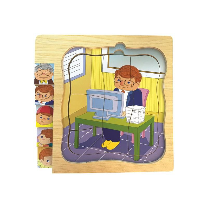 - Wooden layered jigsaw puzzles Grandpa in glasses by TOP BRIGHT - 27 el. MONTESSORI toy. A multi-layered puzzle that brings the stages of a man's life closer together. The puzzle consists of a base (wooden pad) with an image of a toddler and 4 puzzles in s