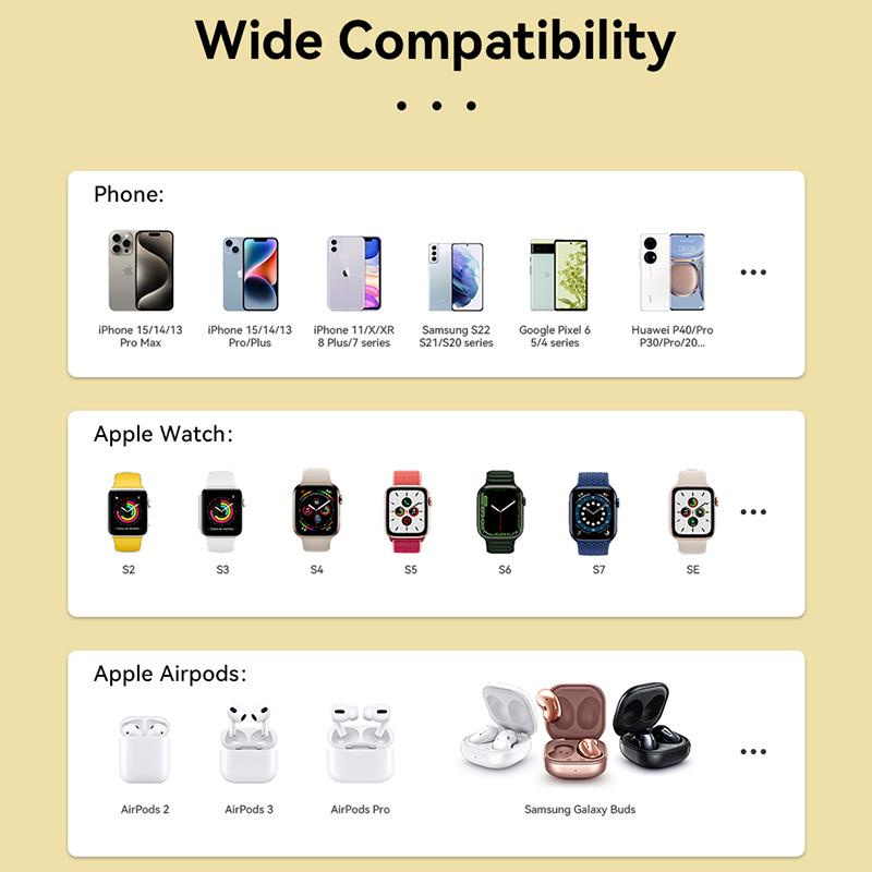 • WEKOME WP-U172 is a modern 3-in-1 wireless charger with MagSafe technology, combining functionality with a sleek, modern design. Designed for iPhone, Apple Watch and AirPods users, this compact charger delivers up to 15W of power,