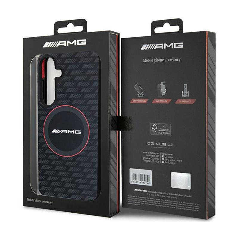 The case decorated with a carbon motif adds elegance and emphasises the modern design, attracting the attention of car enthusiasts. The red line surrounding the MagSafe ring emphasises the sporty nature of the collection, giving the case a distinctive look. Inside the MagSafe ring is a large AMG logo.