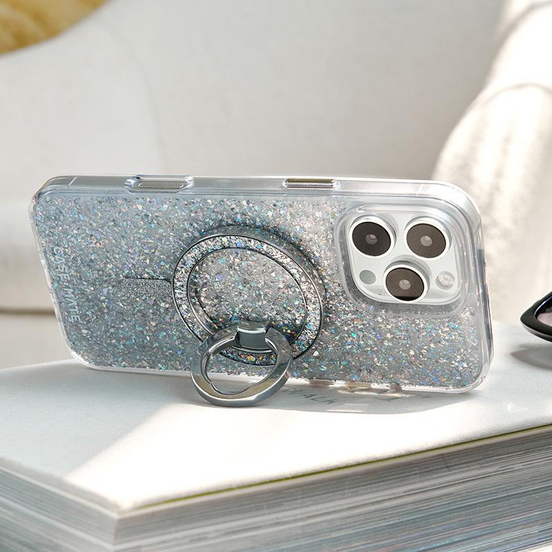- L'étui de protection élégant pour iPhone 16 Pro Max est orné de paillettes et d'éléments de film réfléchissants irisés. Les bords légèrement surélevés autour de l'écran et de l'objectif protègent des rayures. Les aimants intégrés permettent